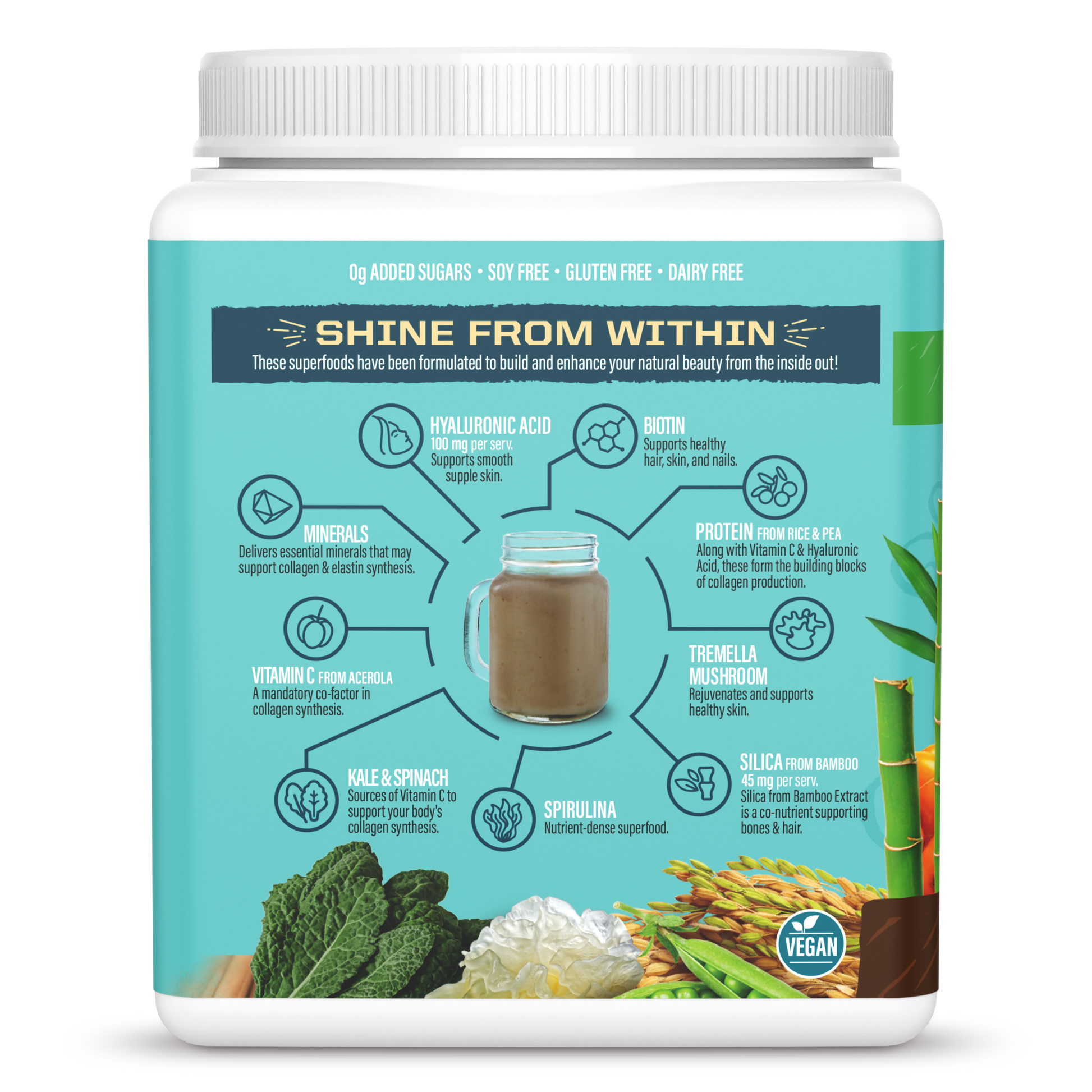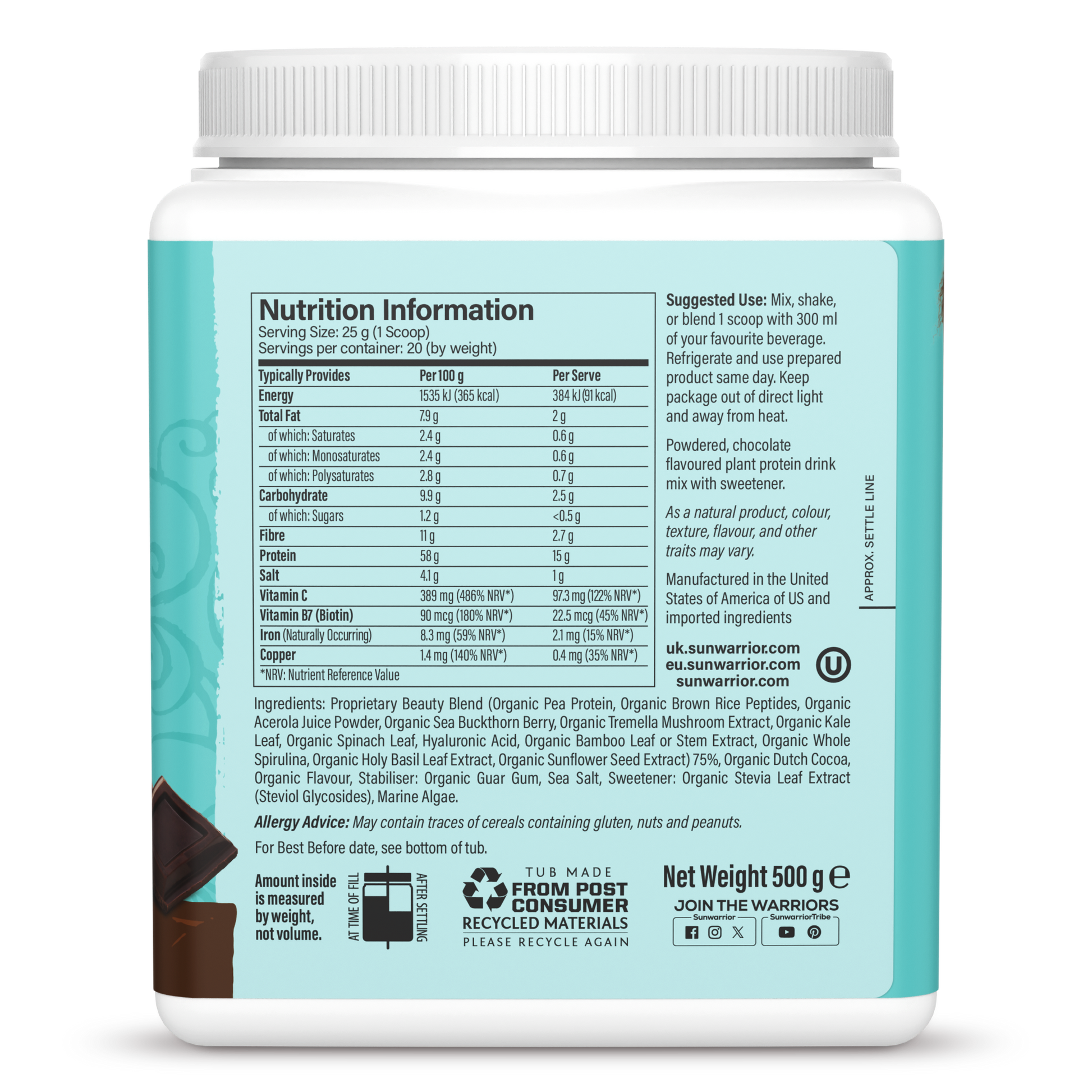 Proprietary Beauty Blend (Organic Fermented Pea Protein, Organic Fermented Brown Rice Peptides, Organic Sea Buckthorn Berry, Organic Tremella Mushroom Extract, Organic Kale Leaf, Organic Spinach Leaf, Vitamin C From Organic Amla Fruit Extract, Hyaluronic Acid, Silica From Bamboo Leaf Or Stem Extract, Organic Whole Spirulina, Biotin From Organic Holy Basil Leaf Extract And Organic Sunflower Seed Extract), Organic Dutch Cocoa, Organic Chocolate Flavour, Organic Guar Gum From Seed, Sea Salt, Organic Stevia Leaf Extract (Steviol Glycosides), Marine Algae.