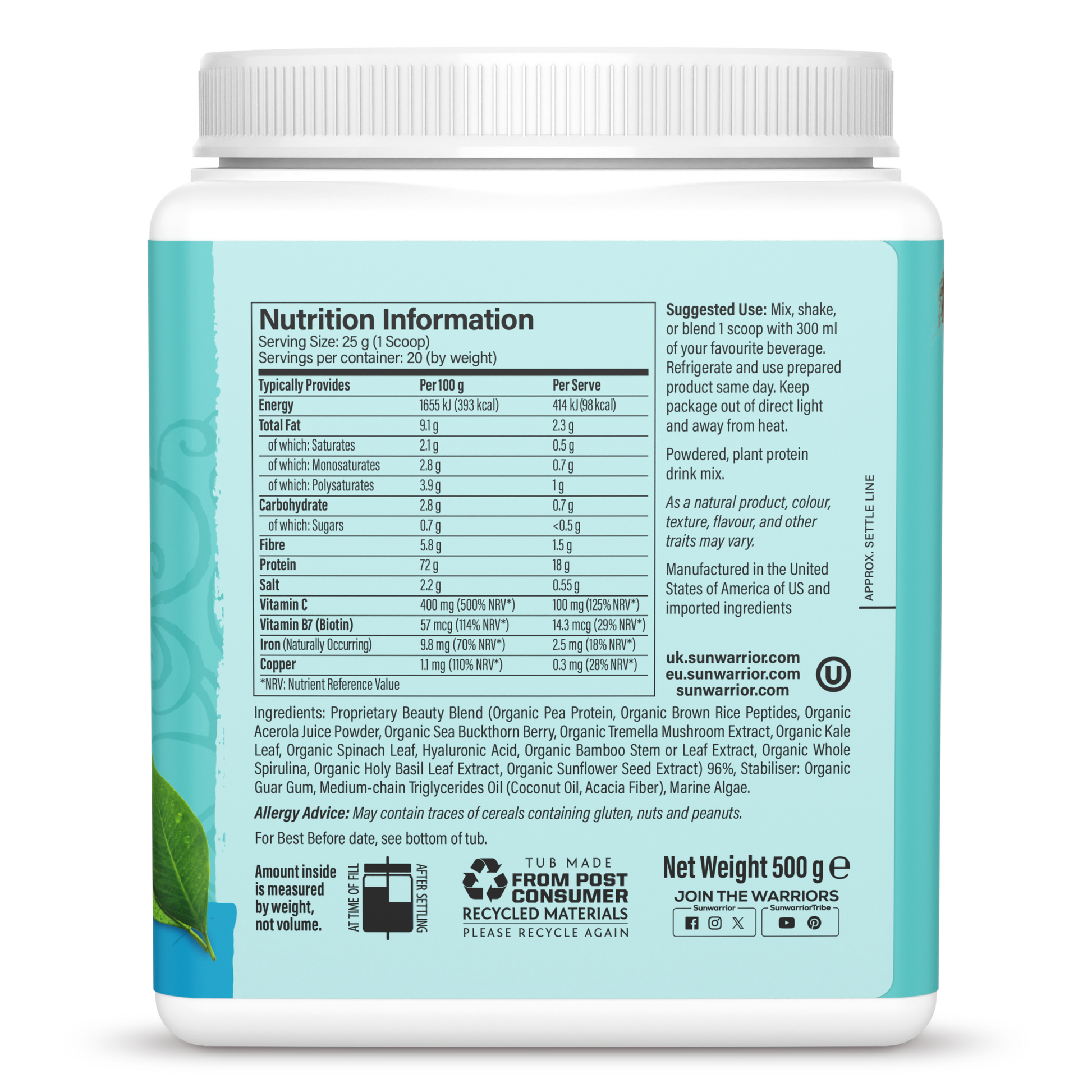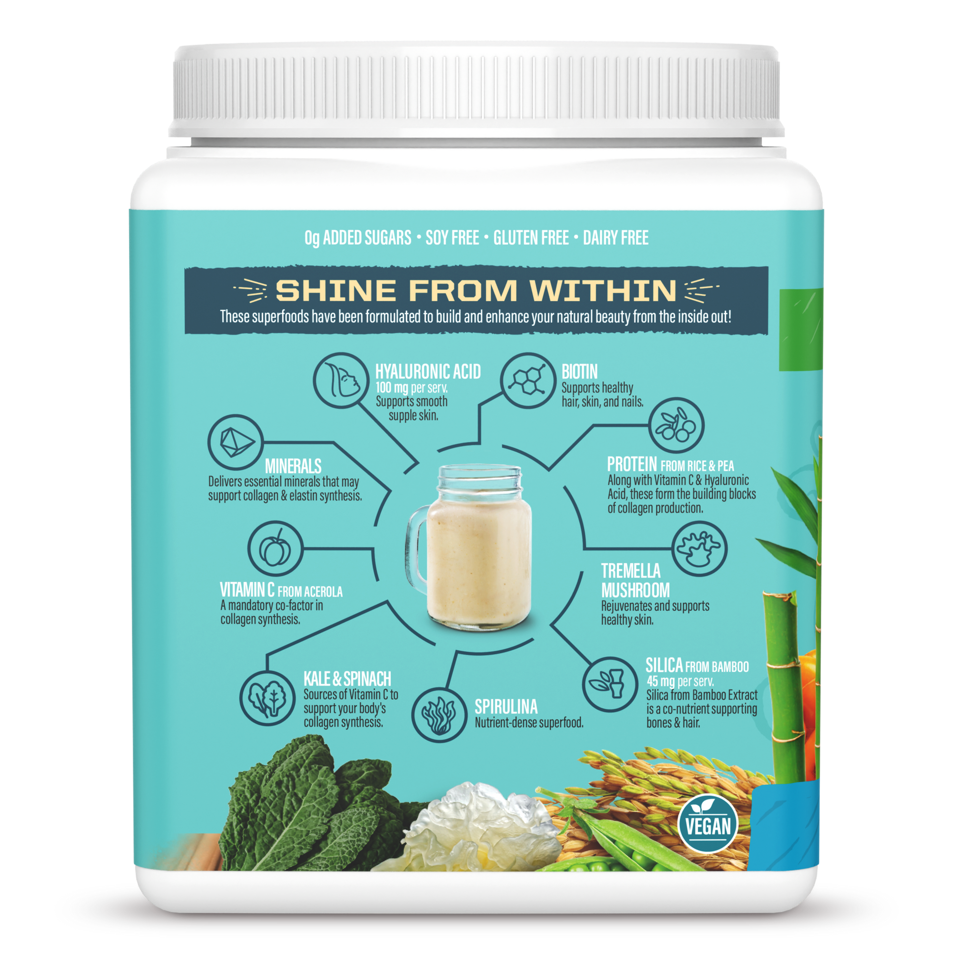 Proprietary Beauty Blend (Organic Fermented Pea Protein, Organic Fermented Brown Rice Peptides, Organic Sea Buckthorn Berry, Organic Tremella Mushroom Extract, Organic Kale Leaf, Organic Spinach Leaf, Vitamin C From Organic Amla Fruit Extract, Hyaluronic Acid, Silica From Bamboo Leaf Or Stem Extract, Organic Whole Spirulina, Biotin From Organic Holy Basil Leaf Extract And Organic Sunflower Seed Extract), Organic Guar Gum From Seed, Medium-Chain Triglycerides Oil From Coconut Oil And Acacia Fiber, Marine Algae.