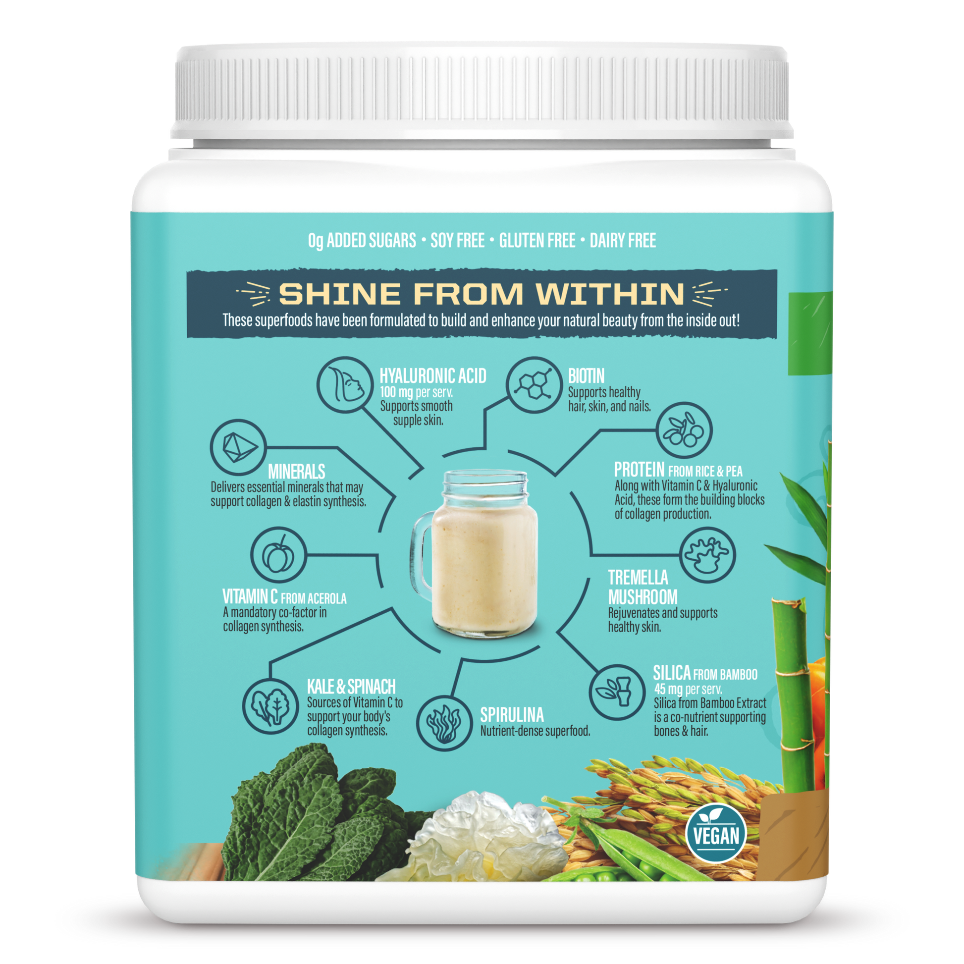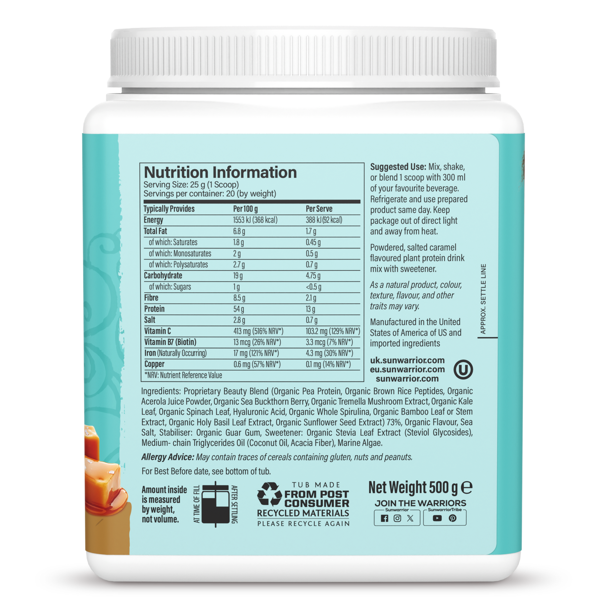 Proprietary Beauty Blend (Organic Fermented Pea Protein, Organic Fermented Brown Rice Peptides, Organic Sea Buckthorn Berry, Organic Tremella Mushroom Extract, Organic Kale Leaf, Organic Spinach Leaf, Vitamin C From Organic Amla Fruit Extract, Hyaluronic Acid, Organic Whole Spirulina, Silica From Bamboo Leaf Or Stem Extract, Biotin From Organic Holy Basil Leaf Extract And Organic Sunflower Seed Extract), Organic Salted Caramel Flavor, Sea Salt, Organic Guar Gum From Seed, Organic Stevia Leaf Extract (Steviol Glycosides), Medium